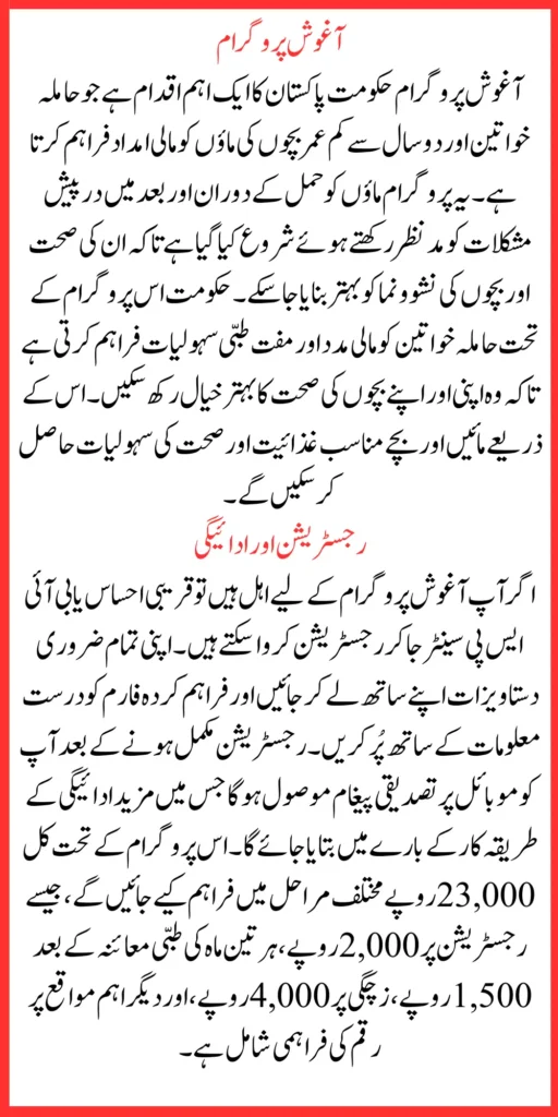 The Aghosh Program is a significant step by the Government of Pakistan to support mothers and children during a crucial stage of life. By providing financial aid and free healthcare, the program ensures mothers receive the care they need and their children grow up healthy and strong. With structured payments and easy registration, the program aims to alleviate financial burdens on marginalized families and create opportunities for better maternal and child health.
