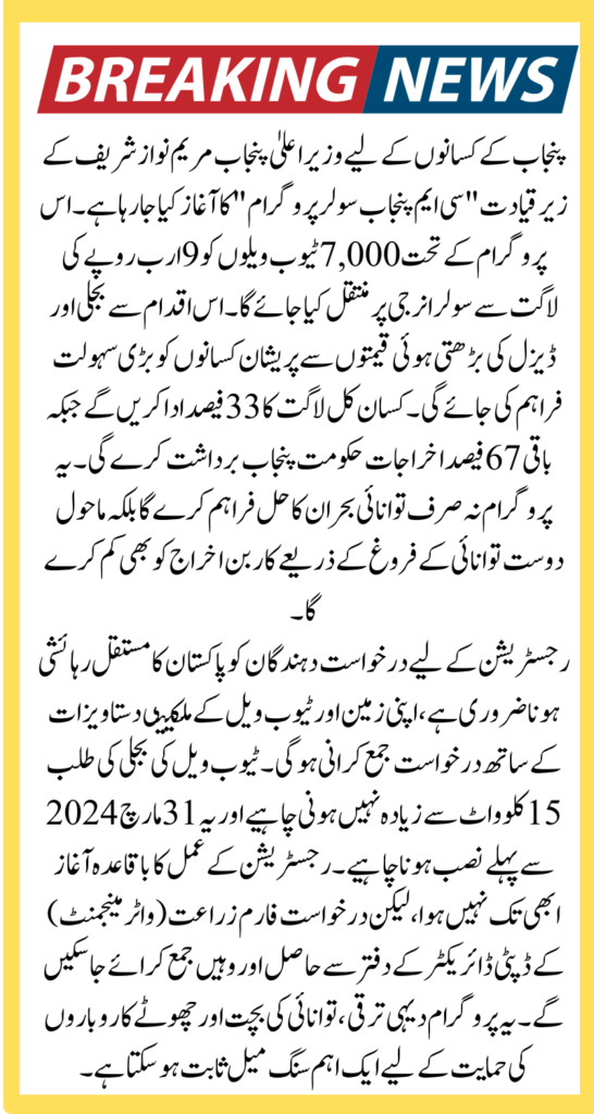 CM Punjab Solarization Program It has been decided to start by the Punjab Chief Minister Maryam Nawaz Sharif for the farmers of Punjab. Under this it is thought to transfer 7 thousand tube wells to solar energy at a cost of 9 billion rupees. With this program, farmers fed up with all the high prices of electricity and diesel will be able to pay 33% of the total cost to switch their tube wells easily run from the solar power, while the rest of the costs will be borne by the Punjab government itself. . Who can benefit from this program? What is the eligibility criteria for you to complete your registration in this program? And you will see all the information in this article. Also, you will find all information related to completing registration in this article and in this program. If you want to get complete details, you have to read this article completely.